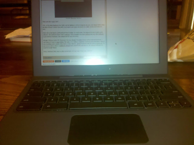 Next post. For now, though, I'm going to focus on the irrelevant hardware. I can't help it; it's just so striking. If they wanted me to ignore the hardware, they ought to have shoved Chrome OS into a Eee PC. Glossy, small screen, generic; easy to ignore. Not this.